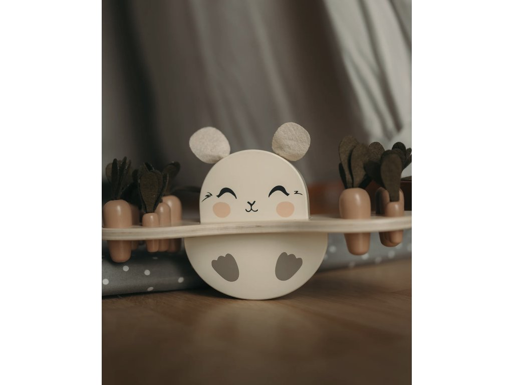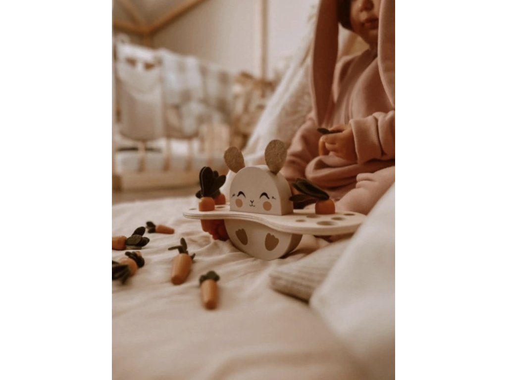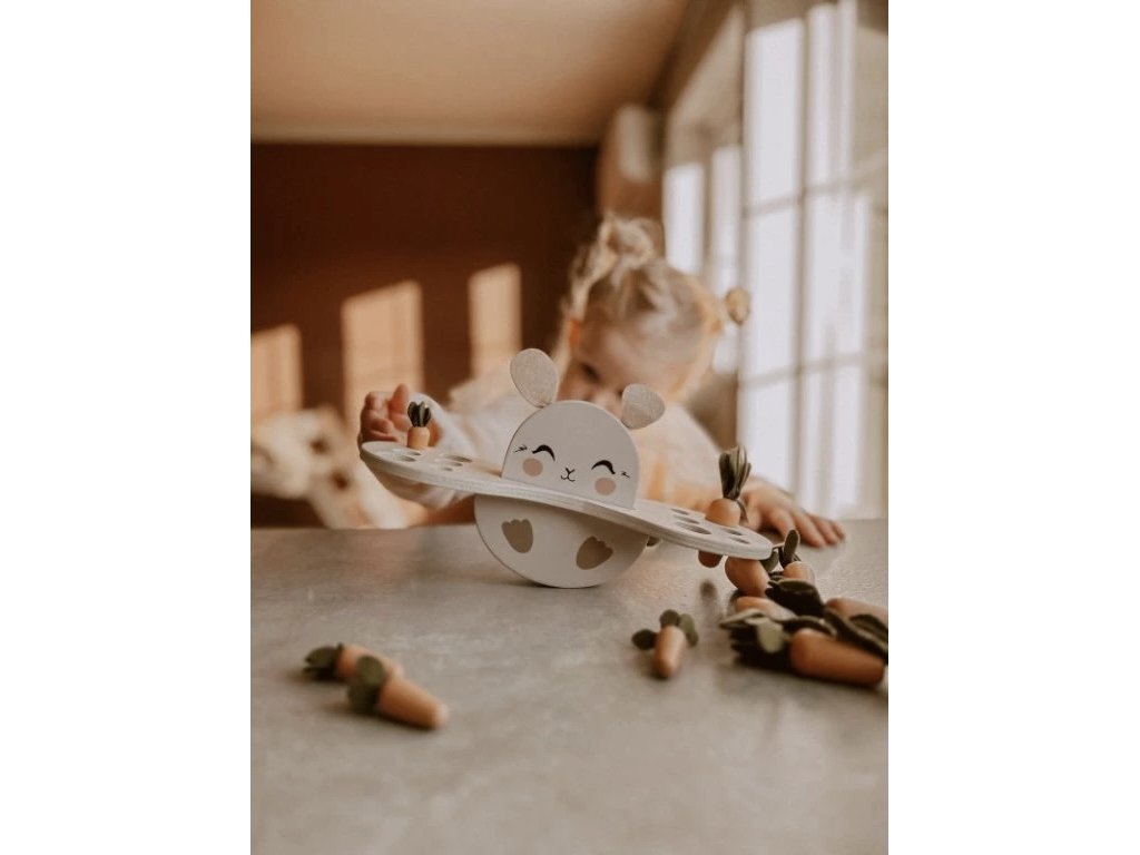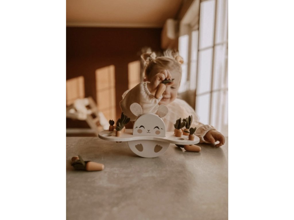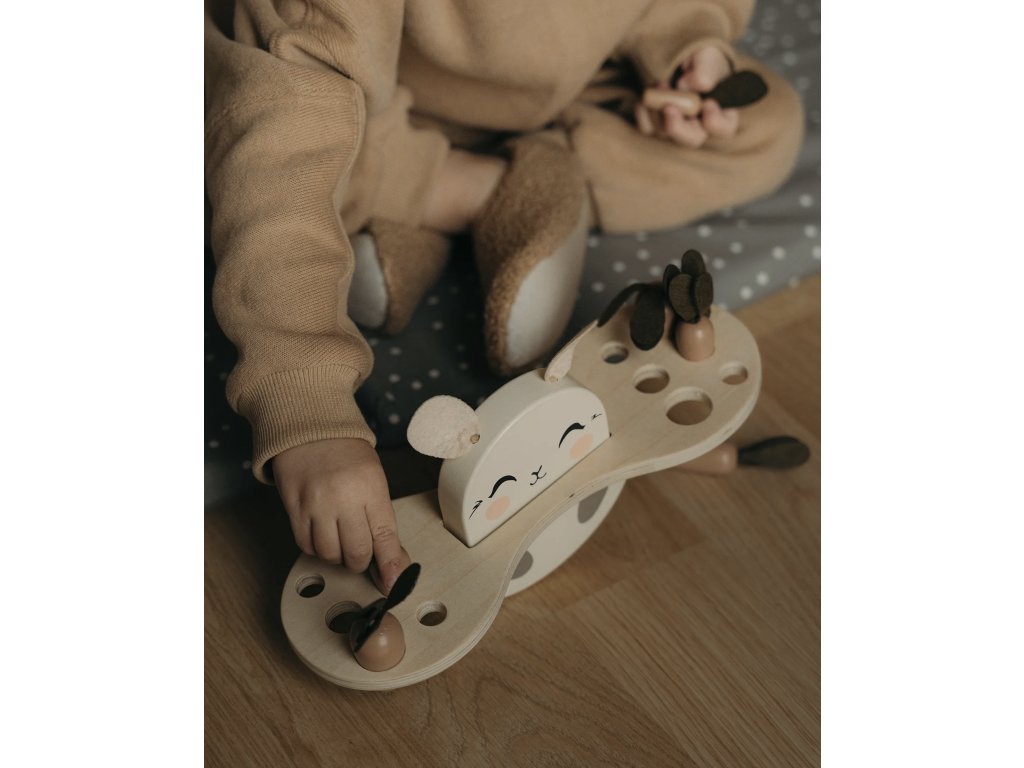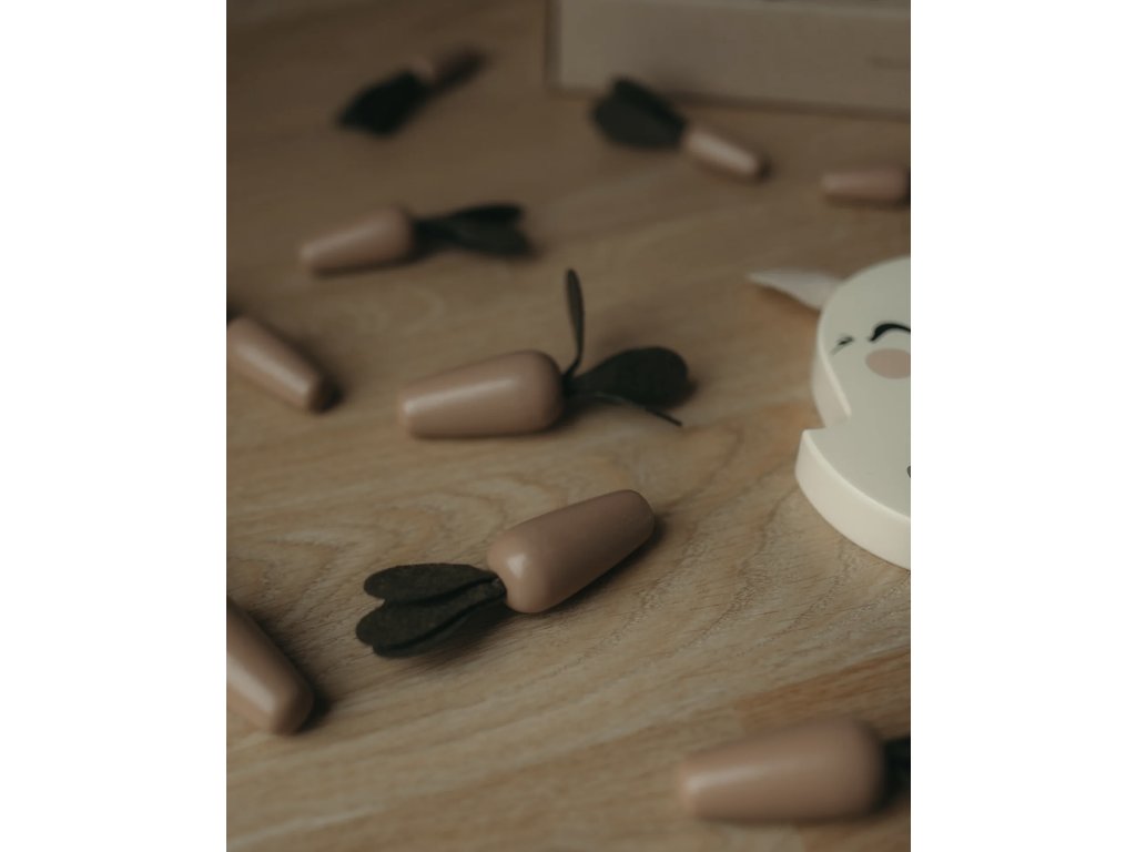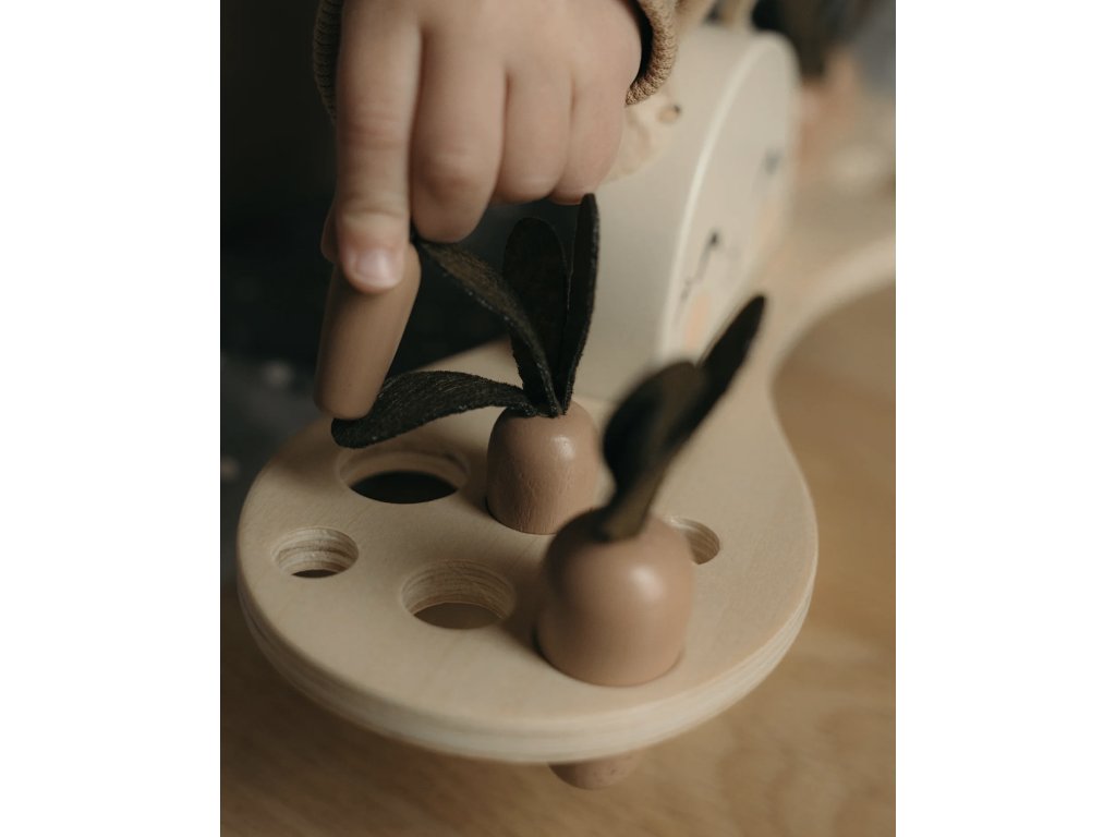Deti môžu usporiadať 12 rôznych veľkostí mrkvičiek do podstavca s 6 dierkami rôzneho priemeru.