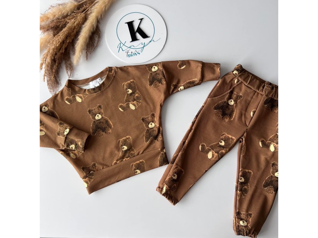 Detský bavlnený komplet s krásnym motívom macíka pozostáva z mikiny a teplákov. Vhodný pre chlapčeka ale aj dievčatko.