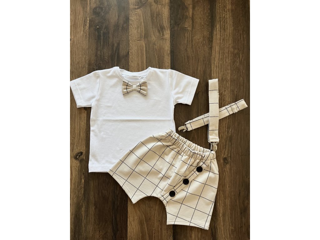 Roztomilý a zároveň elegantný komplet pre chlapcov, ktorý je ako stvorený na slávnostné letné udalosti. Či už je to svadba, krstiny, fotenie  alebo oslava narodenín.  Komplet v štýlovom smotanovom odtieni s čiernym károvaným vzorom zaručí pohodlie a štýl počas horúcich dní.