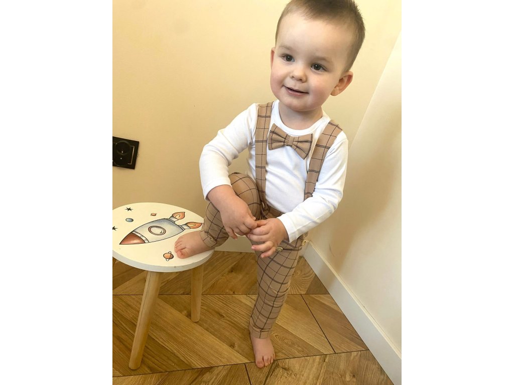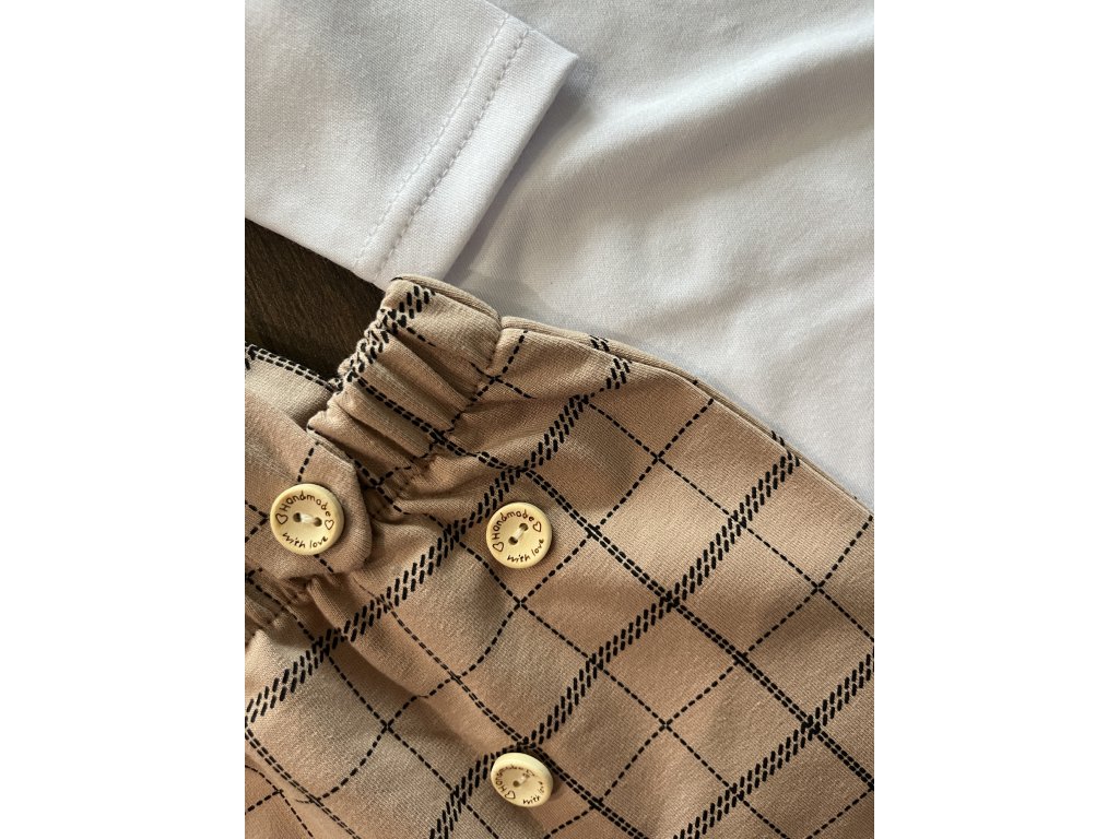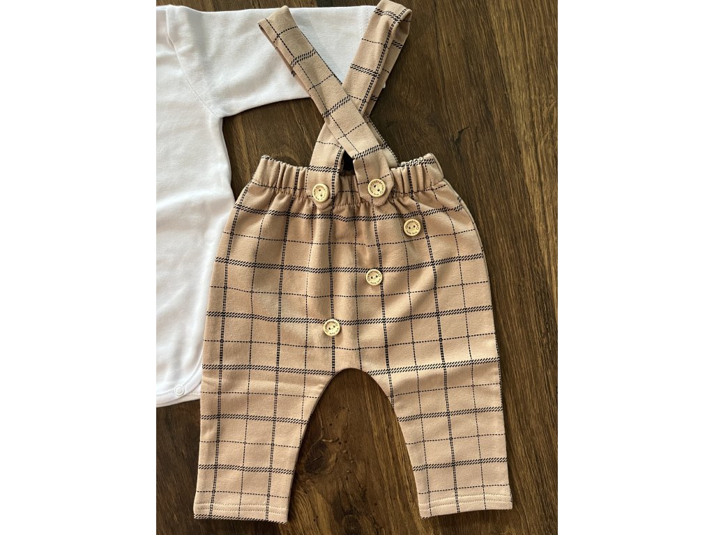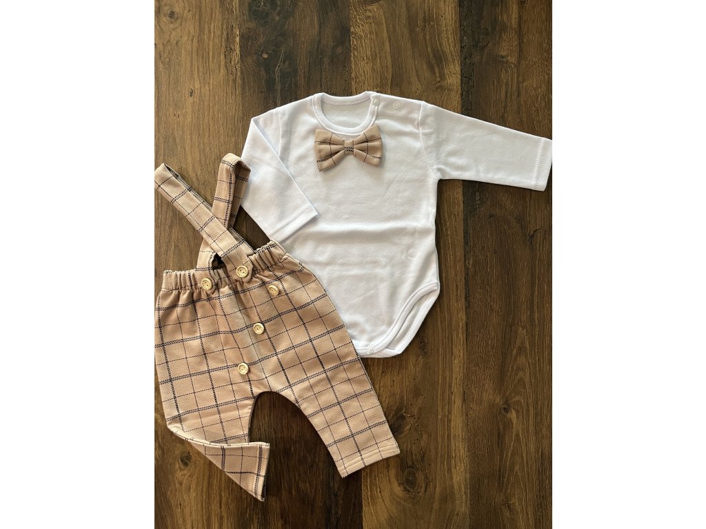 Roztomilý a zároveň elegantný komplet pre najmenších, ktorý je ako stvorený na slávnostné udalosti. Či už je to svadba, krstiny, fotenie  alebo oslava narodenín.  Komplet v štýlovom béžovom odtieni s  jemným čiernym károvaným vzorom zaručí pohodlie a štýl počas celého dňa.
