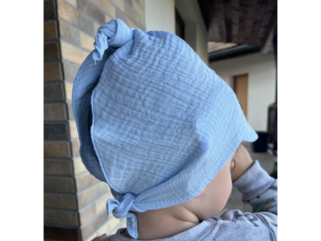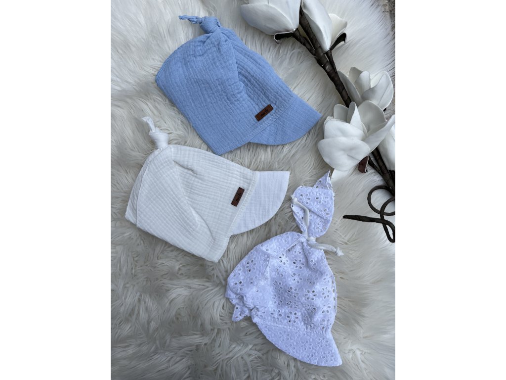Mušelínové šatky sú ideálne na letné obdobie horúčav. Sú veľmi pohodlné, priedušné a dobre sa nosia. Majú šilt, sú na viazanie, čo znamená, že veľkosť je nastaviteľná zaväzovaním vzadu. Ideálne pre deti od 0-3,5 roka. Jednotná veľkosť. Dostupné v modrej, bielej farbe a s bielym kvietkovaným vzorom.