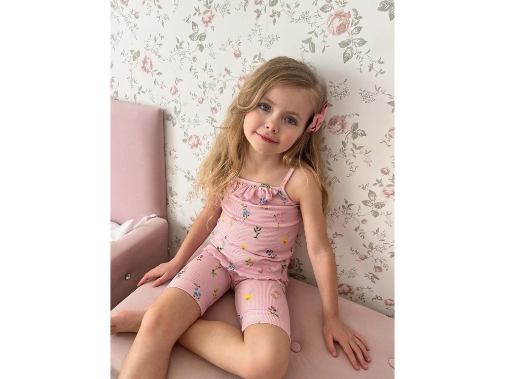 Bavlnený komplet pre dievčatko je krásnym handmade kúskom do šatníka Vašej princeznej. Je šitý z rebrovaného úpletu ružovej farby s motívom kvetov, ktorý si zamilujete Vy aj Vaša dcérka. Set pozostáva z trička na ramienka a moderných cyklo šortiek. Tričko je zdobené volánom, ktorý vytvára roztomilý vzhľad a dodá šmrnc celému outfitu.