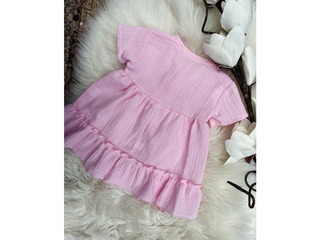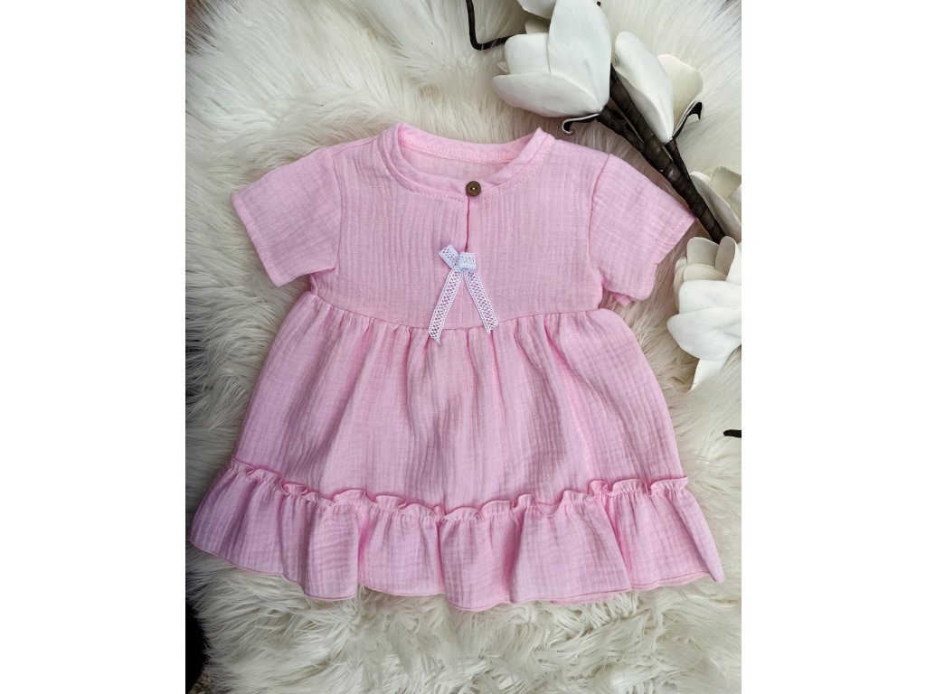 Ružové mušelínové šaty sú šité zo 100% bavlnenej tkaniny mušelínu vhodné pre detičky od narodenia. Mušelín je hebká a priedušná látka šetrná k detskej pokožke. Čím viac sa používa a perie, tým je mäkšia. Šaty sú svetloružovej farby pekného voľného strihu zdobené jemnou mašličkou pri výstrihu, ktorý sa dá zapnúť a rozopnúť dreveným gombíkom. Sú veľmi ľahučké, priedušné, vhodné na letné obdobie. K šatám si Viete doladiť mušelínovú bielu šatku z našej ponuky.